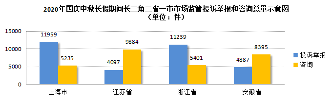 2020年国庆中秋长假期间,长三角地区三省一市市场监管部门依托12315热线和平台, 切实加强监管维权协同联动,着力畅通公众诉求渠道,共同营造良好节日市场环境。