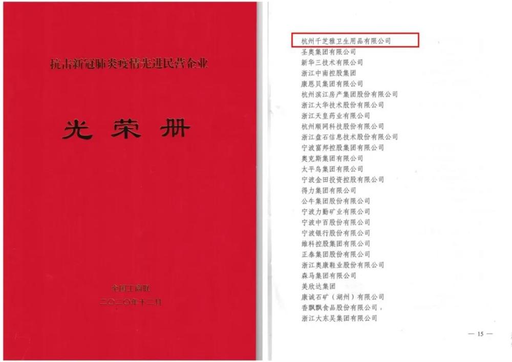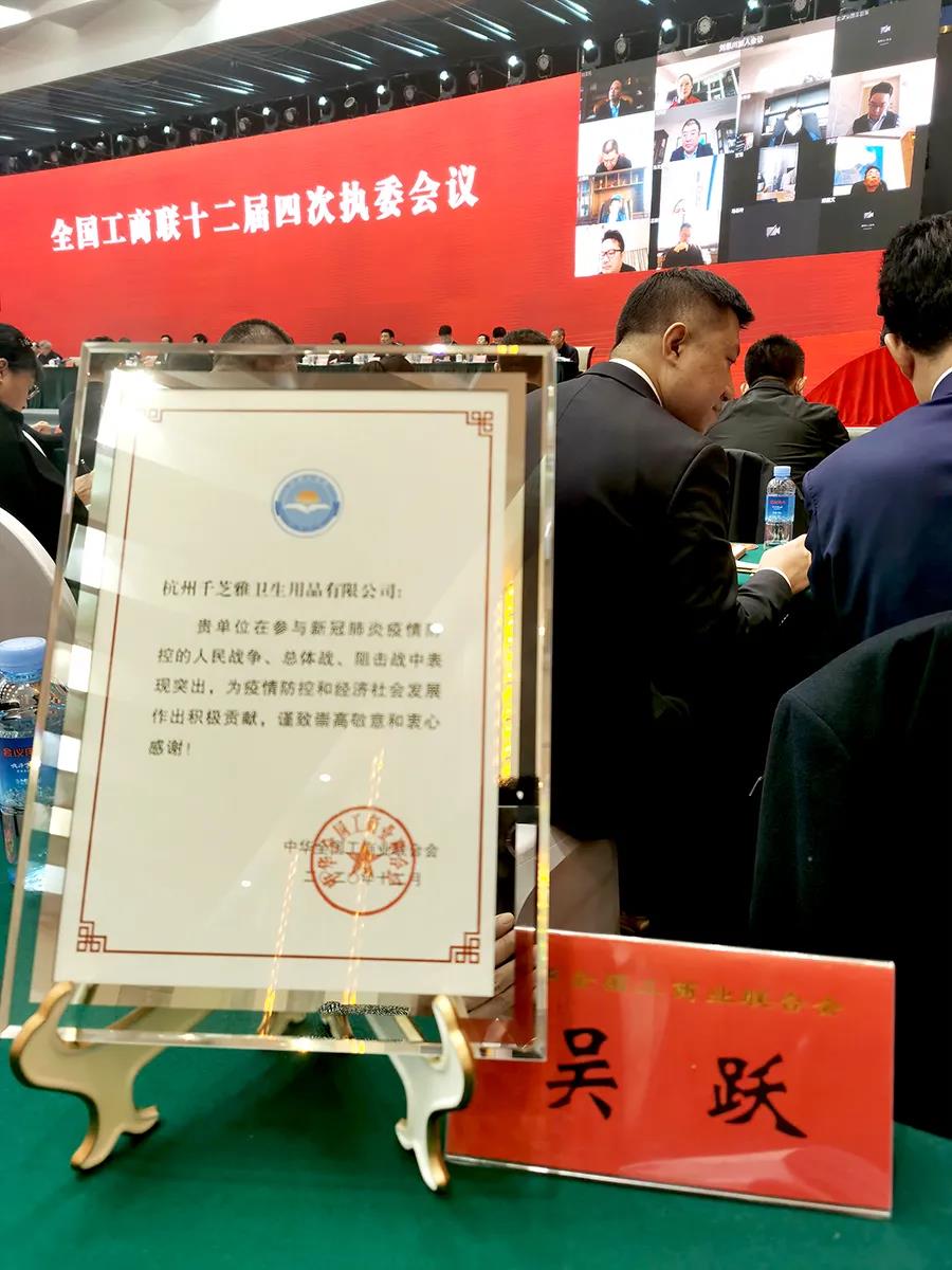 日前,杭州市东阳商会副会长单位、杭州千芝雅卫生用品有限公司荣膺全国“抗击新冠肺炎疫情先进民营企业”称号,可喜可贺!12月21日上午,全国工商联十二届四次执委会议在广西壮族自治区南宁荔园庄园国际会议中心召开。会上,100位民营企业家代表全国抗击新冠肺炎疫情先进企业现场授奖,杭州千芝雅卫生用品有限公司董事长吴跃先生应邀作为浙江省企业代表出席大会,并接受表彰。上半年千芝雅公司全力以赴生产和提供防疫口罩,成绩显著,为全国抗击疫情作出了积极贡献。