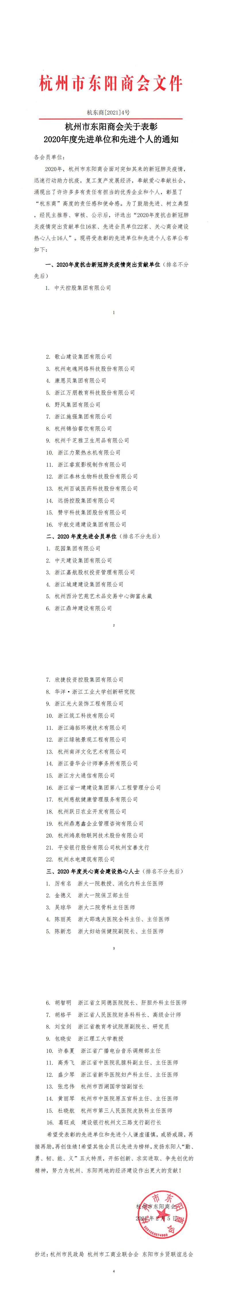 杭州市东阳商会关于表彰2020年度先进单位和先进个人的通知