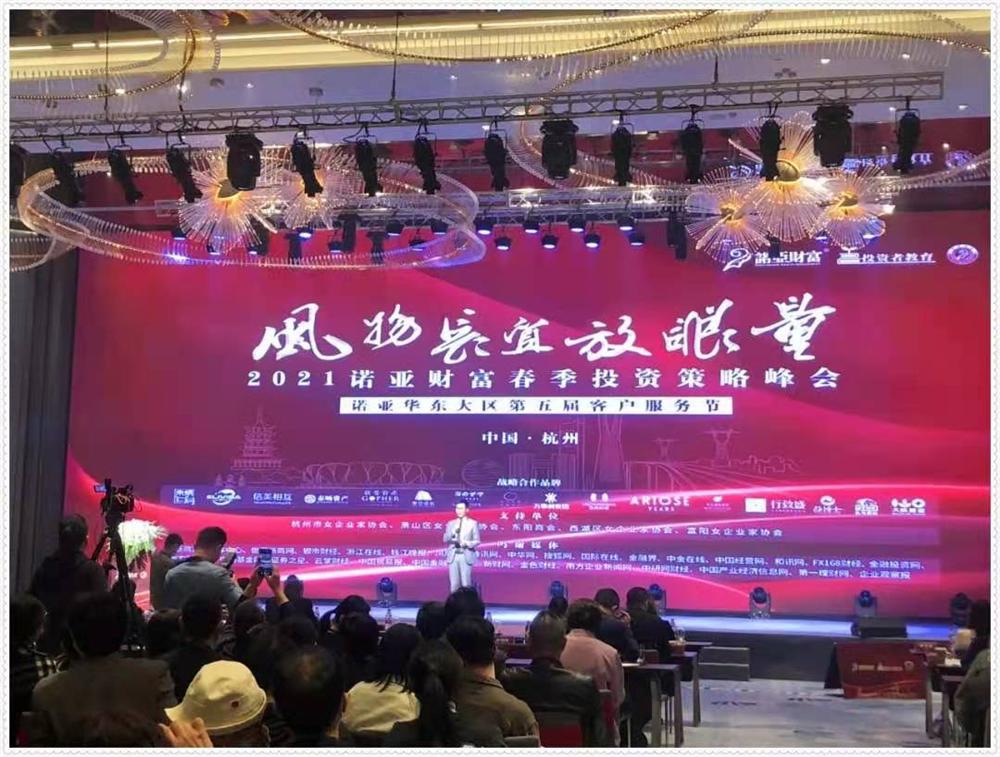4月10日,杭州市东阳商会组织会员参加了杭州“2021诺亚财富春季投资策略峰会”,商会副秘书长周园英、副会长杭州好安健客科技有限公司董事长朱美芳、会员杭州鼎慧鑫企业管理咨询有限公司总经理金祖军、杭州戈登自动化工程有限公司总经理郭冠鹏等10人参加了投资策略峰会的学习。本次会议由我商会会员单位诺亚(萧山)财富管理中心举办。
