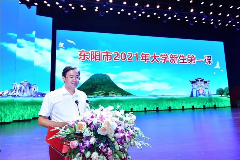 8月19日上午,杭州市东阳商会秘书处李惠兰和周园英等商会代表应邀参加了“东阳市2021年大学新生第一课”。这是东阳市委书记傅显明连续第3年为即将踏入大学校园的东阳籍大学新生上第一课,市人大常委会主任朱志杰、市政协主席斯建民、东阳人联谊总会会长王正明,以及市领导胡勇春、柳尊科、龚杭娟等领导出席。本次活动在东阳横店圆明新园夏苑海晏堂隆重举行,800多名大学新生代表参加。大会由东阳市委副书记、市长楼琅坚主持。