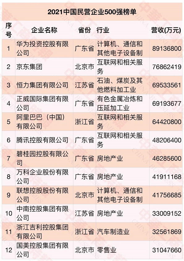 据悉,民营企业500强入围门槛达235.01亿元,比上年增加32.97亿元。13家企业营业收入超3000亿元,其中,华为投资控股有限公司、京东集团、恒力集团有限公司、正威国际集团有限公司、阿里巴巴(中国)有限公司等5家企业营业收入超过6000亿元。