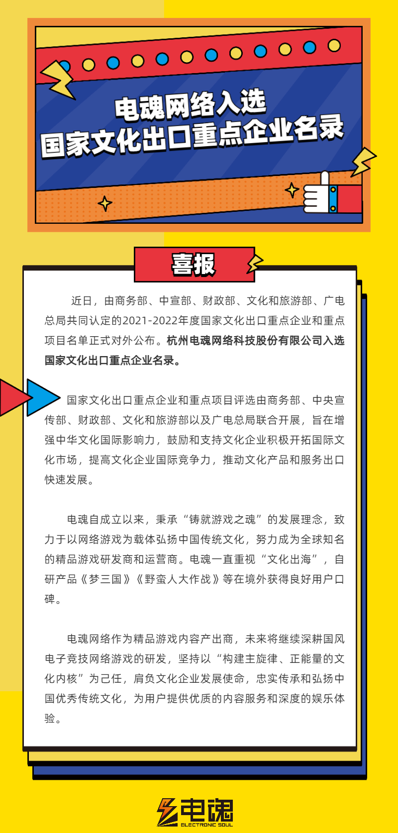 祝贺杭州电魂网络科技股份有限公司入选由商务部、中宣部、财政部、文化和旅游部、广电局共同认定的2021-2022年度国家文化出口重点企业和重点项目名录。