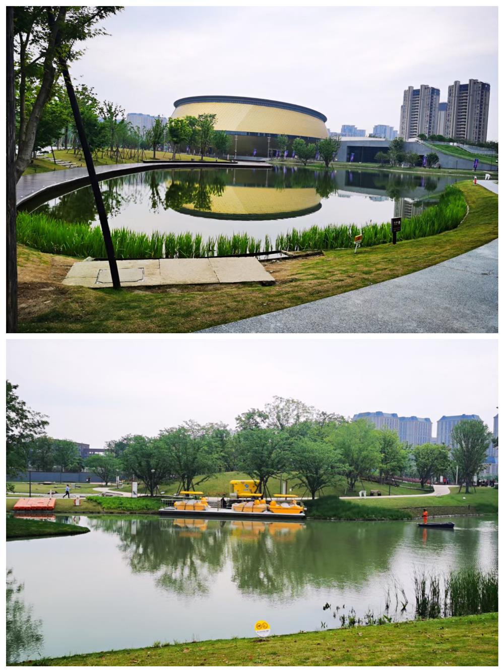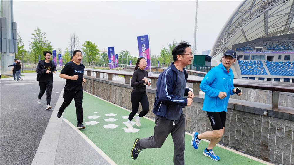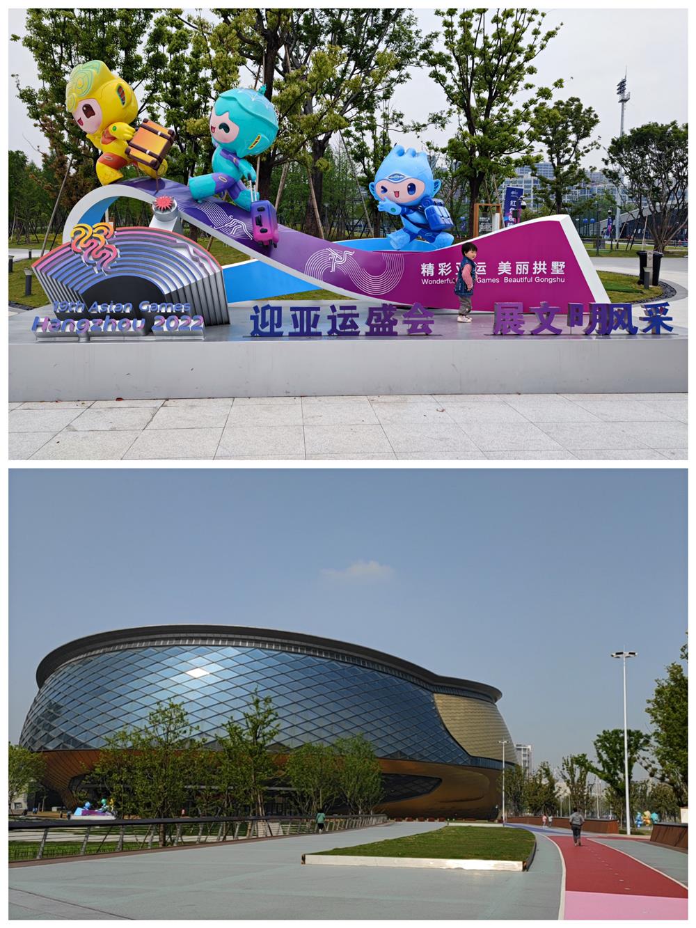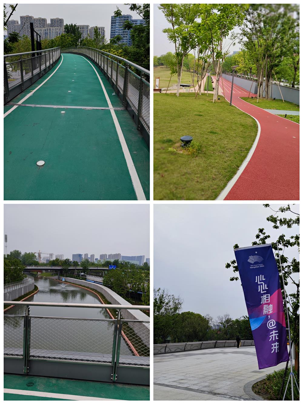 在占地700多亩的诺大公园里,大家跑着跑着就跑散了。因为在春天鲜花盛开之时,沿线风景实在太美了,不仅有树有花、有草坪、还有湖、游乐区、有横跨马路的空中跑道、有曲棍球比赛场馆及训练区、亚运吉祥物雕塑、还有非常显眼的标志性体育场馆——国球中心。跑步时放眼远方,周边的拱墅区建筑及景物尽收眼底,跑在如此优美的环境中,心情很好,中途停下来拍拍照赏赏景,跑点弯路不可避免。当天上午虽然气温有点低,但来到公园跑步走路、游玩的市民、孩子络绎不绝。