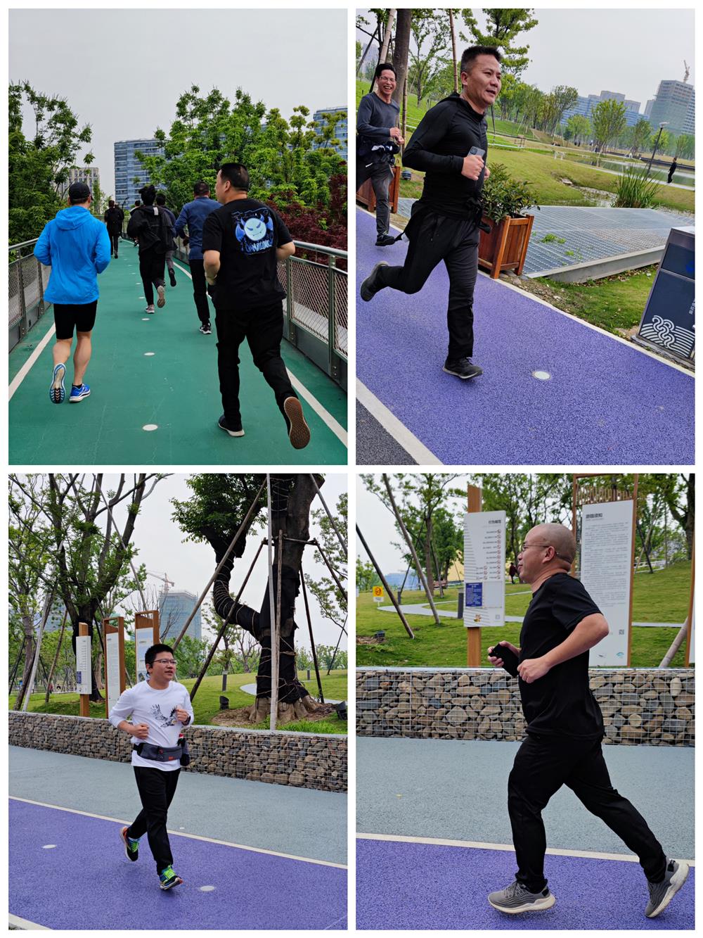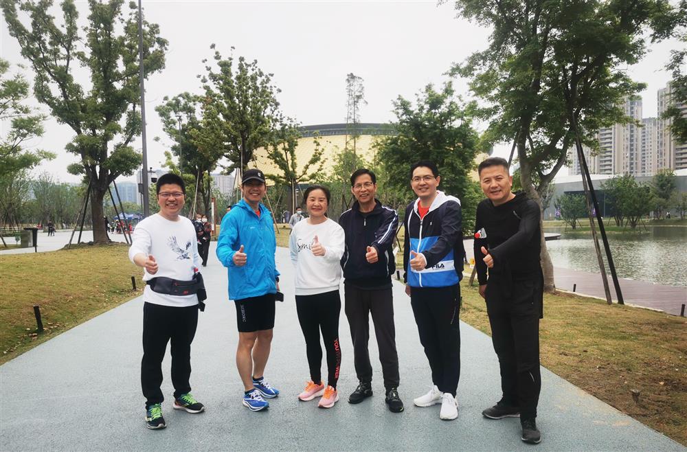 当日阴天,气温10多度,非常适合在空旷的公园里跑步。大家难得聚在一起,既兴奋又激动,欢呼着集体出发!一行人沿着彩色跑道向前奔跑,长跑经验最丰富的常务副会长郭一群作为本次活动团长引领跑步,他让大家一开始速度不要太快,以免后续力量不足,他的跑姿漂亮而身体轻盈,看他跑步丝毫没有累的感觉,而是一种享受。跑到一公里左右,商会跑步健将们基本上保持前后跑,慢慢地较弱者与跑神们拉开了距离,平时缺少锻炼的人这时甘愿落后,以保证体力能多跑一些路程。有六年跑步经验的方笑,平时跑步很勤,当日早上在大家一起跑之前,已经提早在公园里跑了1个小时,此时状态依然很好,始终跑在最前面,实力不容小觑。而身材精瘦的胡思新,也是位跑步高手,平时每公里配速保持在4分40秒上下,他已经在亚运公园跑过多次,熟悉公园跑步路线,女子跑马爱好者任云翔紧跟其后,两人一起跑完全程。