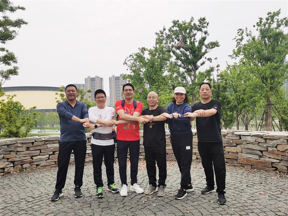 杭州大运河亚运公园真是个运动比赛、跑步、赏景的好地方,较早结束的跑友聚在一起或交流或拍照,陈飞龙、黄永庆、楼政权、葛龙刚、周园英和厉锡平六人紧紧携手一起向未来,个个笑容灿烂,春风得意地拍了张合影。在等待的同时增进了彼此了解,加深了印象,11点钟大家陆续返回起点。