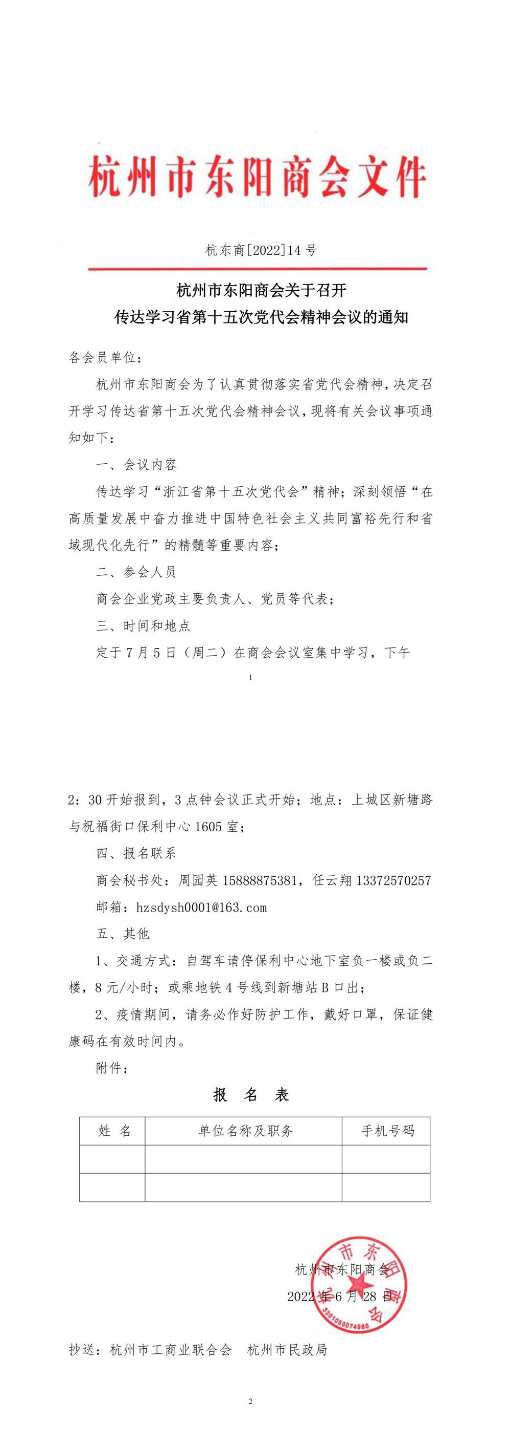 杭州市东阳商会关于召开传达学习省第十五次党代会精神会议的通知