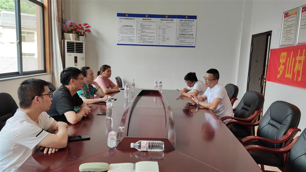 6月29日下午,商会秘书处李惠兰、周园英与杭州运河集团建设管理有限公司吕总等聆听结对村罗山村书记黄锋介绍村情况