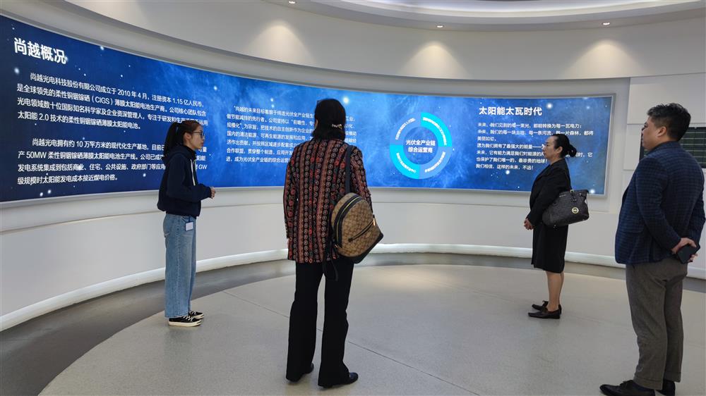尚越光电公司任宇刚副总经理陪同秘书处人员参观了诺大的柔性光伏产品展示厅,边看边介绍产品性能、用途和优势。尚越光电是全球光伏3.0全产业链综合运营商,专注于超薄柔性铜铟镓硒(CIGS)薄膜太阳能电池的规模化生产和应用开发。公司成立于2010年,团队核心人员由多名海外博士、光电领域国际知名专家组成,经过10余年发展,已建成亚洲唯一一条可量产50MW超薄柔性铜铟镓硒薄膜太阳能电池生产线,产品具备“轻、薄、柔”的优势,成功将太阳能3.0技术应用到商业、住宅、智慧城市、公共设施、日常生活等广泛领域,达到零能耗低碳效果。公司为国家高新技术企业,现已申请国内外专利300余项,已授权200多项,被授予“浙江省院士专家工作站”,得到了多位国家领导人、省市领导的亲切关怀与司指导。