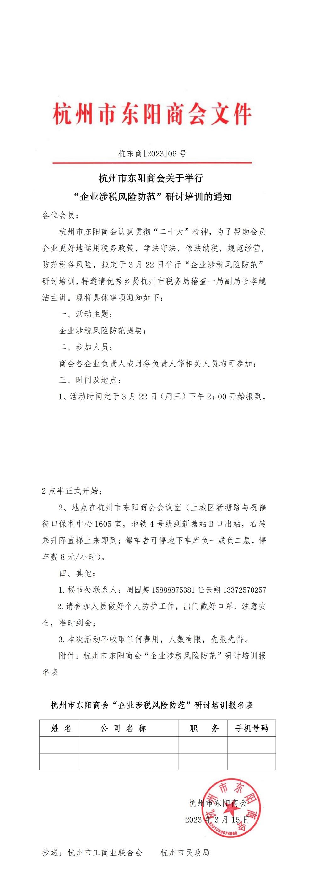 杭州市东阳商会关于举行“企业涉税风险防范”研讨培训的通知