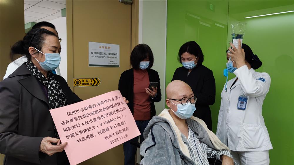 11月29日下午,杭州东阳商会秘书处李惠兰、周园英等一行三人前往浙一医院余杭院区3号楼血液科住院部,带着商会会员和在杭乡贤们的深切关爱看望了身患急性淋巴细胞白血病患者蒋*珏同学,并将158882.86元爱心捐款送到了小蒋妈妈手中。同时向在场的病区余主任和周护士长询问了解蒋同学的病情治疗相关情况。余主任对杭州东阳商会雪中送炭的爱心行动赞不绝口,感谢为保障小蒋的疗程接力送来了及时雨。