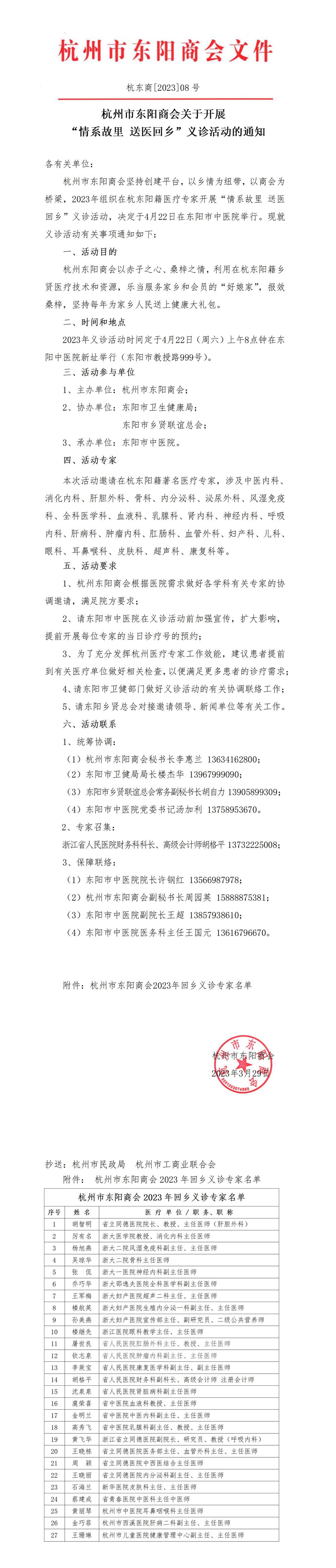 杭州市东阳商会关于开展“情系故里 送医回乡”义诊活动的通知