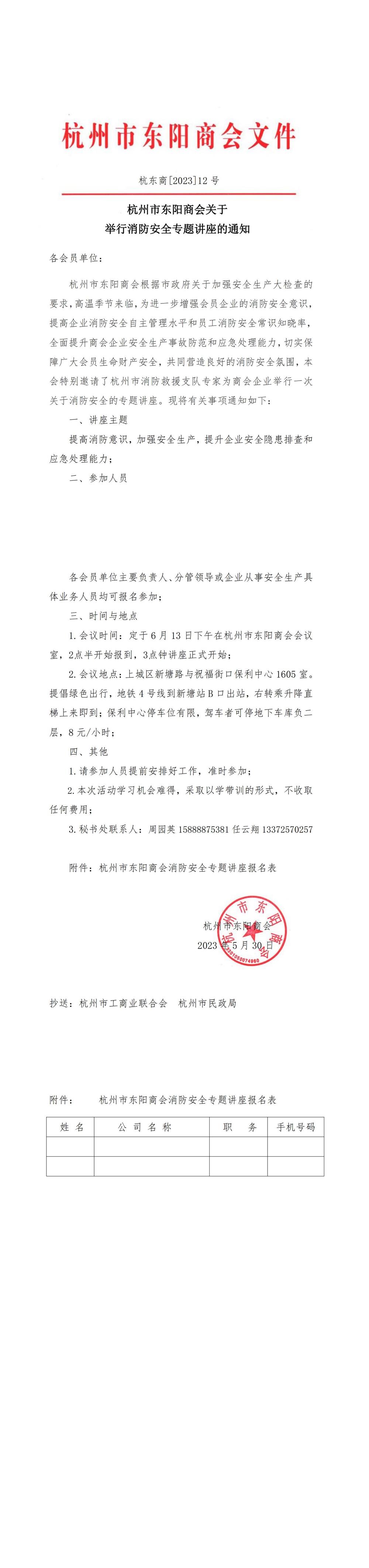 杭州市东阳商会关于举行消防安全专题讲座的通知