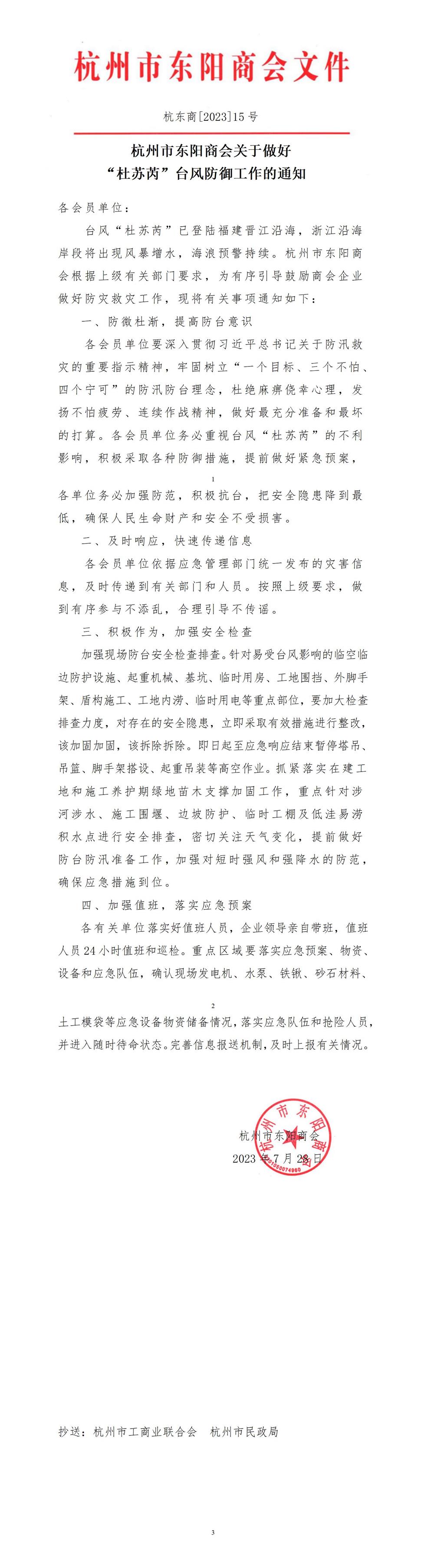 杭州市东阳商会关于做好 “杜苏芮”台风防御工作的通知