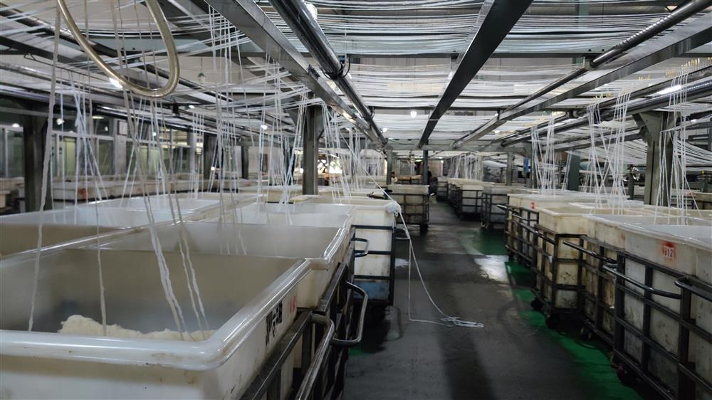 座谈结束后,楼江伟陪同秘书处人员参观占地50亩的工业园区。走进生产车间,大型自动化流水线机器隆隆作响,大家亲眼目睹了白色特种纤维从面条一样宽再到比头发丝还细的牵拉全过程,流水线生产工艺令人叹为观止,想不到纤细超轻的一条线能应用到航空航天、工业建材等领域。