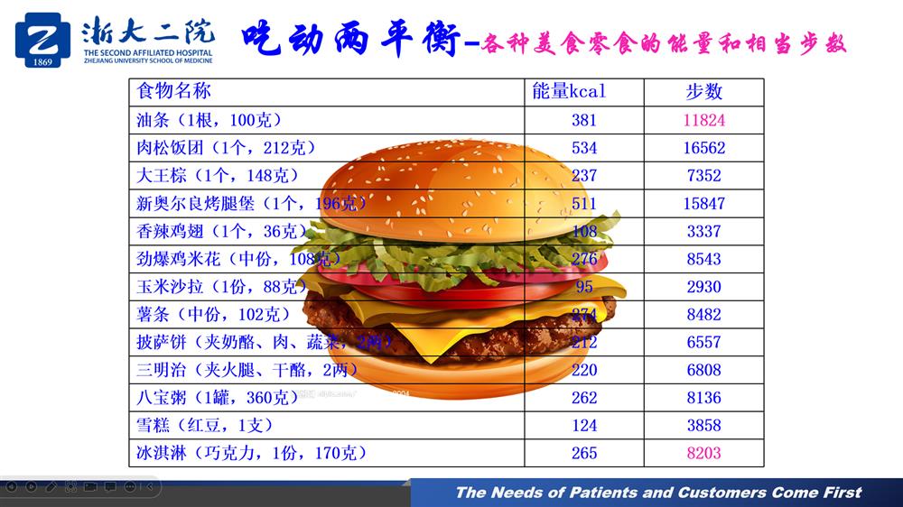 健康是人人都关心的问题,而掌握正确的饮食结构和合适的运动方式显得尤为重要。营养搭配运动,让参会者掌握科学健康的营养知识,是这堂课的主要内容。张片红主任以肥胖给人带来的危害为引子,讲了促进健康的方向:一是治疗疾病;二是预防保健。通过平时的营养饮食、规律运动、适度休息以及改变不良习惯(如吸烟、酗酒)达到整体健康。营养要全面、均衡、适量,与大家分享了中国居民膳食指南:一 、食物多样,合理搭配。建议摄入的主要食物种类数,平均每天摄入12种食物,每周摄入25种,包括谷类粗粮、蔬菜水果、肉鱼蛋、牛奶坚果等;二、吃动平衡,健康体重。食不过量,每餐少吃一口,减少在外就餐;坚持日常锻炼,主动身体活动最好每天6?000步,适当进行高强度有氧运动,加强抗阻运动,每周2-3天;三、多吃蔬果、奶类、全谷、大豆;四、适量吃鱼、禽、蛋、瘦肉。鸡蛋营养丰富,吃鸡蛋不弃蛋黄。优先选择鱼,少吃肥肉和腌制肉制品;五、少盐少油,控糖限酒;吃一根油条需要走12000步来消耗卡路里;吃一个冰淇淋则需要走8200步;六、规律进餐,足量饮水。一日三餐,定时定量,不漏餐;成年人每天喝水1500ml以上;七、会烹会选,会看标签;八、公筷分餐,杜绝浪费。张片红主任还讲解了肥胖者和消瘦者的饮食注意事项,特别强调了适当运动对身体健康的重要性。