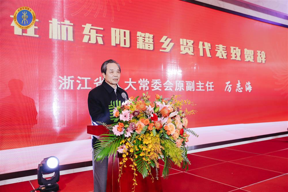 东阳市委书记楼琅坚代表东阳市四套班子对杭州市东阳商会成立十周年表示祝贺。他高度评价了商会十年来的卓越贡献,不仅为在杭东阳人搭建了一个团结互助、合作共赢的平台,还积极助力家乡东阳的发展,体现了强烈的社会责任感和家国情怀。楼书记表示:当下的东阳正处在大建设、大发展、大跨越的重要阶段,处于从不断起势向整体成势突破突围的关键时期。希望商会进一步做大平台、做好服务,打造会员企业可信赖、可依靠的“好娘家”;希望广大会员企业勇立潮头、再创辉煌,发扬东阳人文精神和创业创新精神,勇当时代发展的“弄潮儿”;希望广大在杭东阳人始终不忘乡音、情系桑梓,一如既往当好东阳“窗口”、讲好东阳故事,积极为家乡招商引资、招才引智牵线搭桥,为家乡发展作出更大贡献。