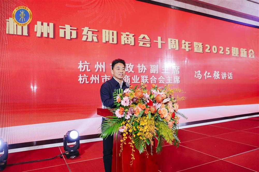杭州市政协副主席、市工商业联合会主席冯仁强对杭州市东阳商会成立十周年表示祝贺,对在杭东阳人、东阳籍企业家为杭州这座城市发展作出的贡献表示感谢。他说,东阳人杰地灵、人才辈出。在新时期新阶段,杭州城市能级、城市规模、城市美誉度、国际影响力都有了新的提升。希望杭州市东阳商会继续按照政治建会、团结立会、服务兴会的要求,团结在杭东阳籍企业家和乡亲,积极促进非公有制经济健康发展和非公有制经济人士健康成长,服务好会员企业、服务好在杭乡亲、服务好杭州东阳两地发展,争创“四好商会”,打造“5A社团”。