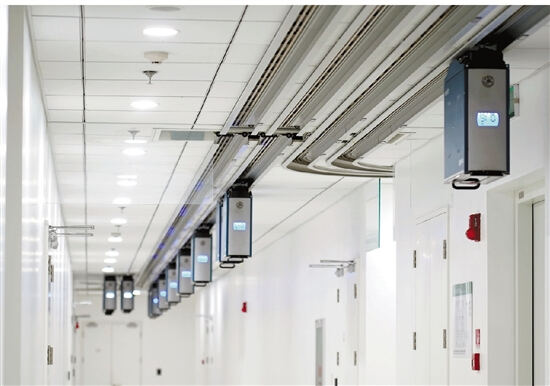 轨道小车在医院的吊顶穿行,可以运送10公斤以内的药品、耗材等。