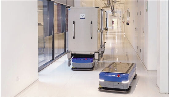 看得见的,是医院格局的重塑、就医流程的优化。在更多患者看不到的地方,多项系统也在高效运转:轨道小车在医院的吊顶穿行,长达3900米的小车物流系统,可以运送10公斤以内的药品、耗材等。此外,楼层之间还有穿梭的“小旋风”气动物流系统,以及自行上下电梯送货送餐的智能机器人AGV导航车,“三兄弟”让物流系统“飞天遁地”。