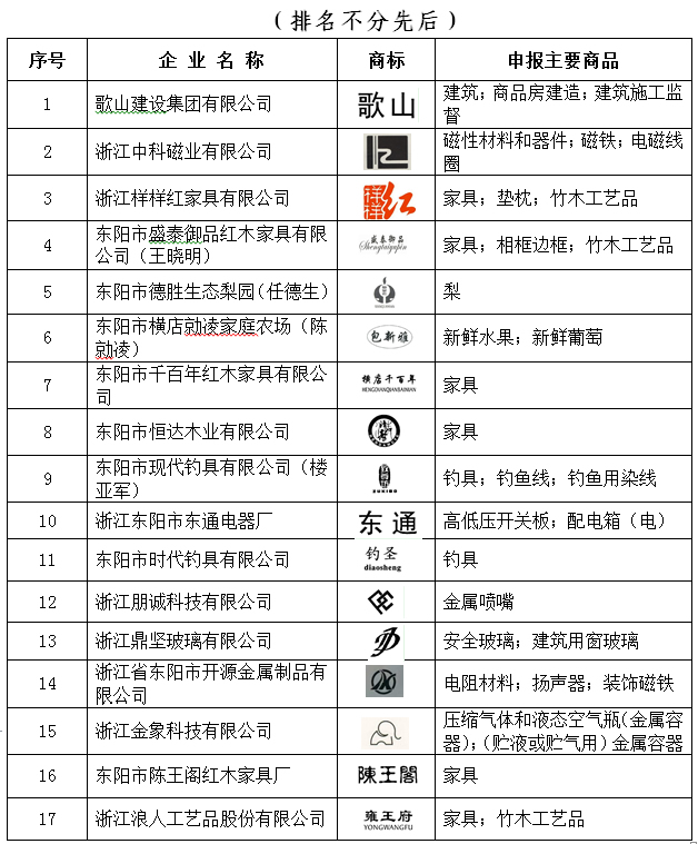 2016年度东阳市知名商标名单