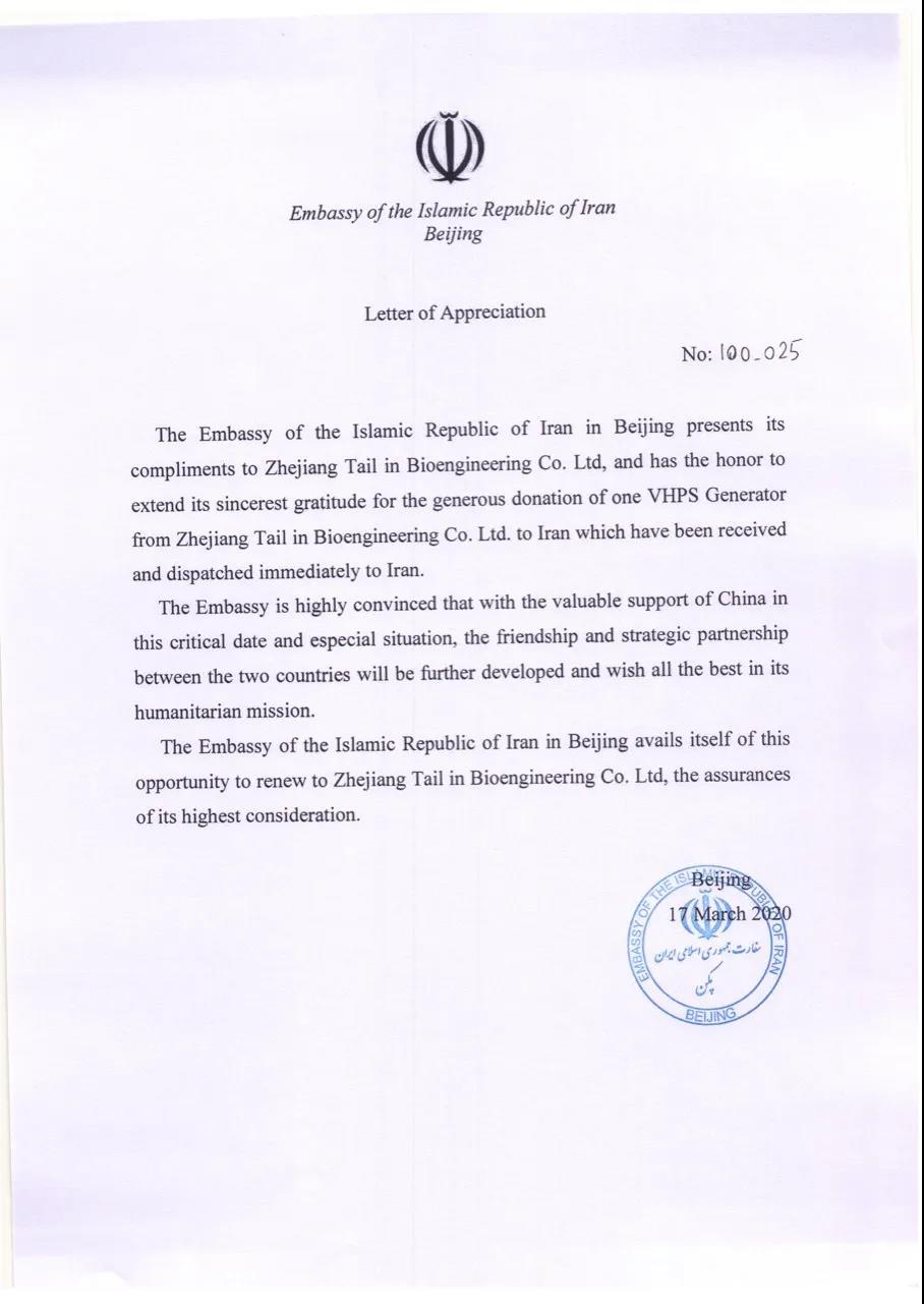 3月17日,泰林生物收到了来自伊朗驻北京大使馆的感谢信,对公司为伊朗人民慷慨捐赠汽化过氧化氢消毒设备表示诚挚感谢,并表示设备已经收到并立即送去伊朗。大使馆坚信,在这重要时刻和特殊形势下,有中国政府和人民的宝贵支持,两国友谊和战略伙伴关系必将得到进一步发展。伊朗驻北京大使馆借此机会再次向泰林生物表达最崇高的敬意。